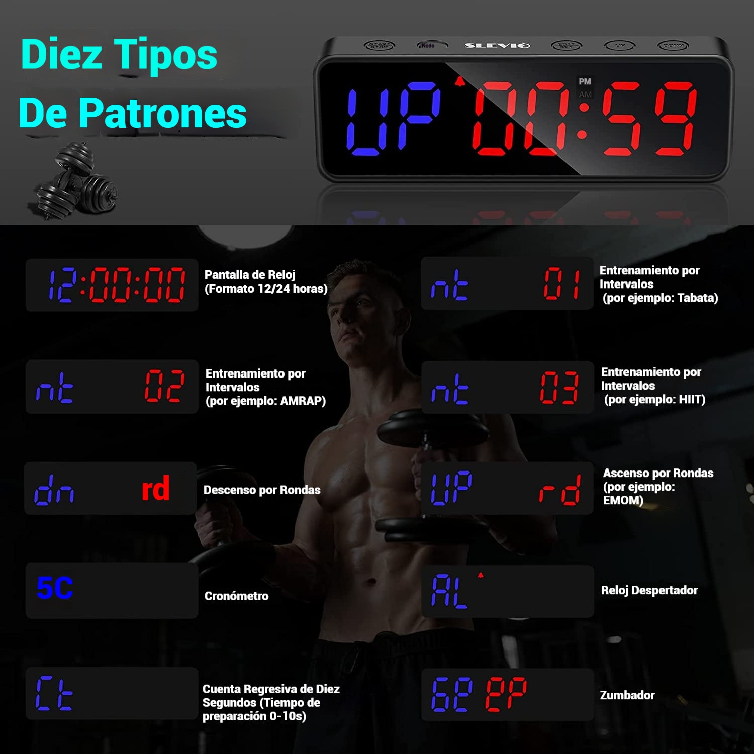 Incluye (cL) Pantalla de reloj, (nt) Personalizado para intervalo (ej. Tabata), (UP) Cuenta hacia arriba, (UP rd) Cuenta hacia arriba por ronda (ej. EMOM), (dn) Cuenta hacia abajo, (dn rd) Cuenta hacia abajo por ronda, (sc) Cronómetro, (AL) Reloj con alarma, (CT)Cuenta atrás de diez segundos, (beep) Control de zumbador.
