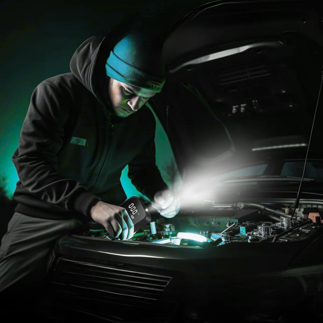 Pompka waży tylko 500 gramów i z łatwością mieści się w plecaku, aucie czy skrzynce z narzędziami. Mocna bateria wystarcza na napompowanie 5–6 opon samochodowych na jednym ładowaniu. A jeśli się rozładuje, możesz dalej używać jej przez gniazdko zapalniczki samochodowej lub sieć elektryczną – bez przerw.